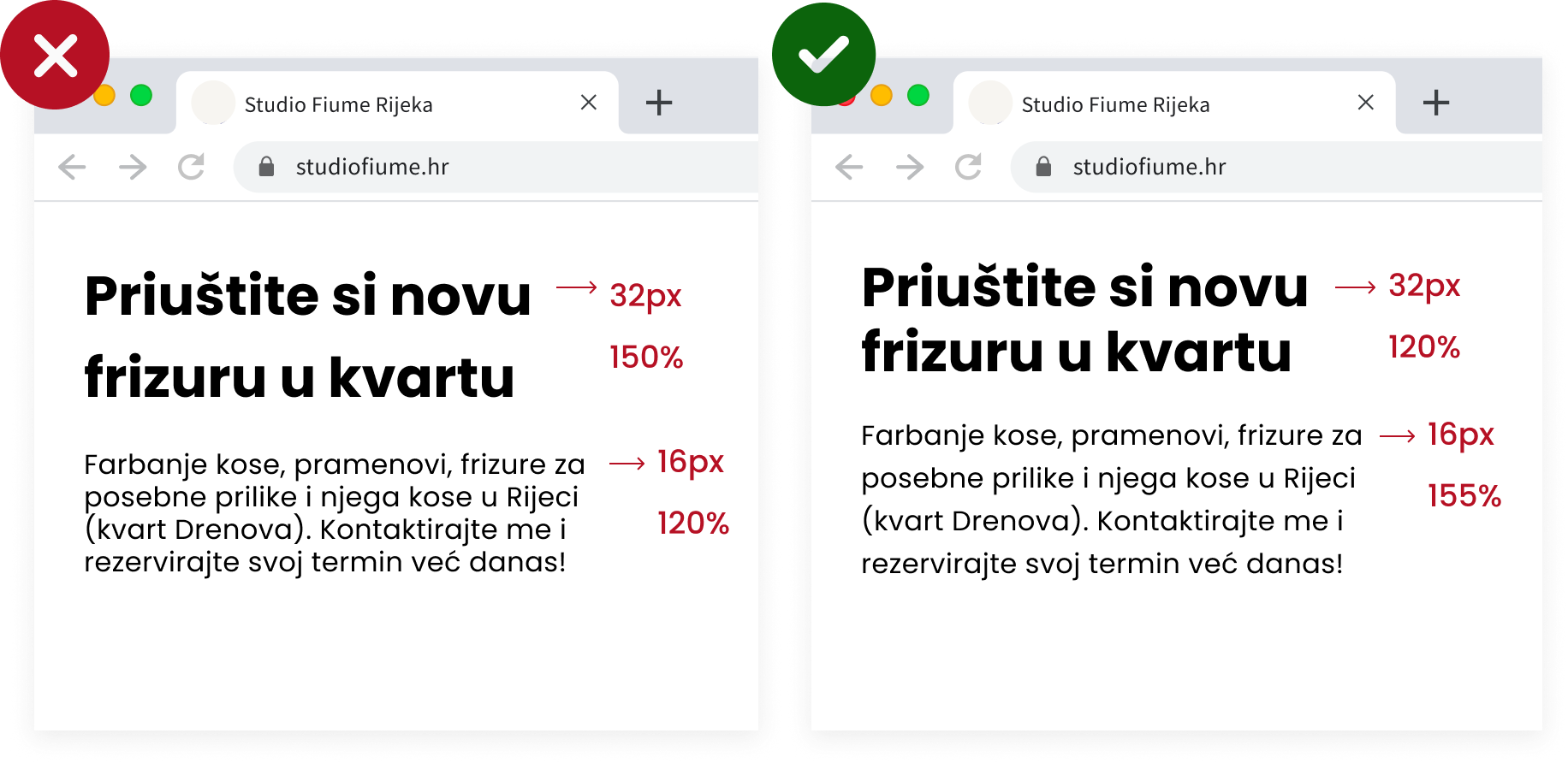 Dobro pravilo kod mijenjanja veličine fonta jest da ju udvostručite ili prepolovite. Npr., ako koristite